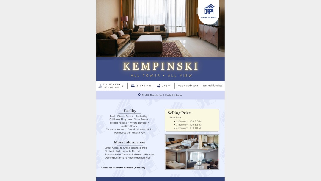 - Direct access to Mall Grand Indonesia, strategic location (Thamrin), CBD Thamrin-Sudirman and walking distance to Mall Plaza Indonesia.
